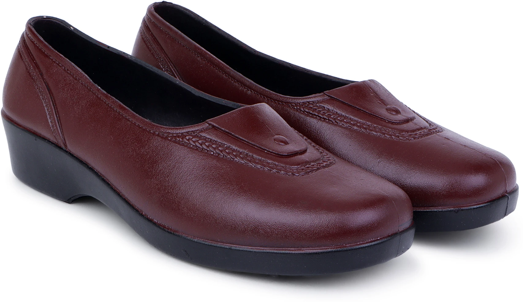 Elegant brown PVC slip-on flat with low block heel and decorative vamp detail. Comfortable everyday wear for office, college and casual use. Also see B3 quilted style.